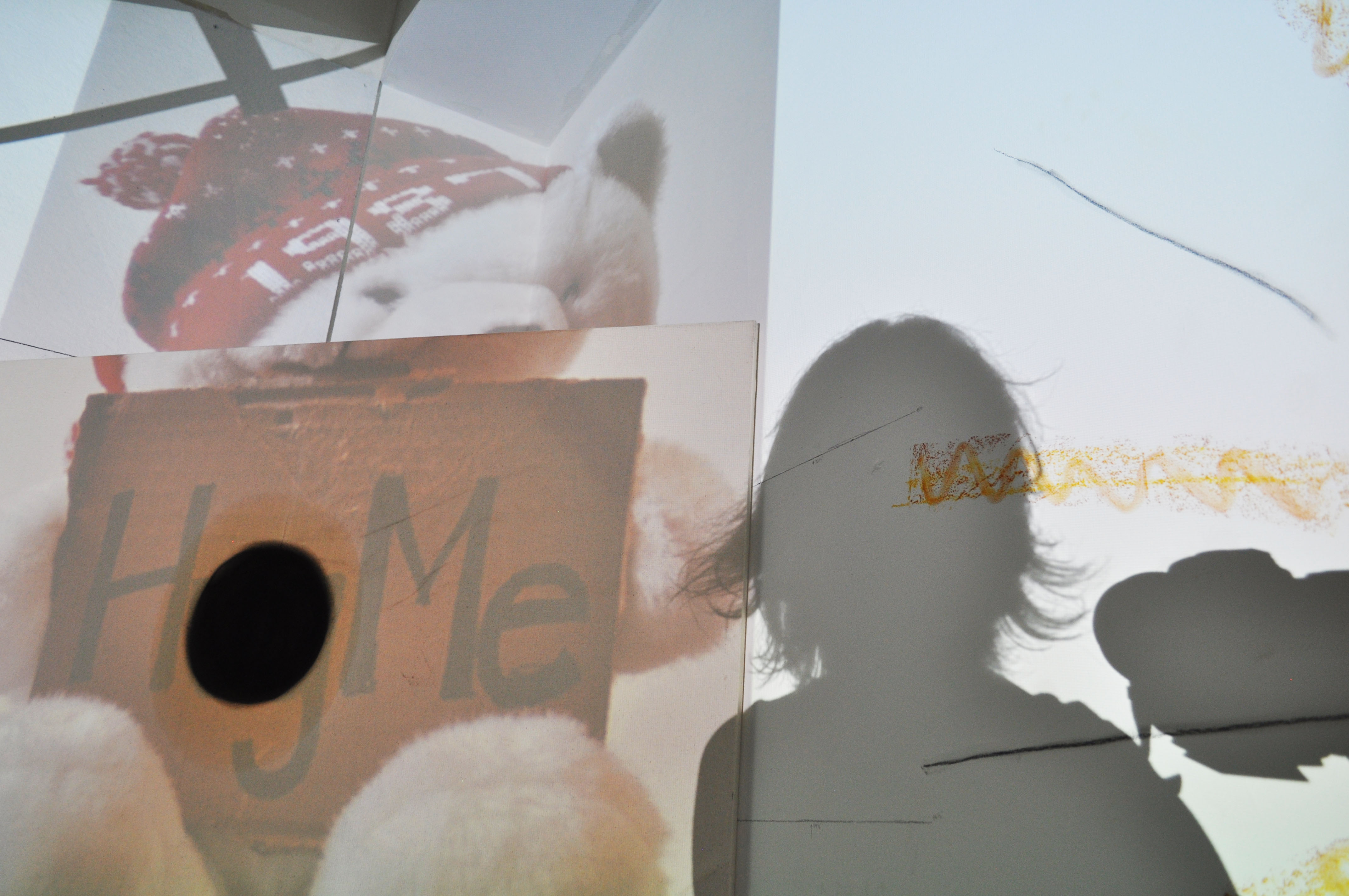 “The Absurd is the “constant confrontation between the human need and the unreasonable silence of the world. (Camus, philosophy index)” Look at the bear in image 3, begging desperately for a hug. Yet it is a projection making it impossible to ever be hugged. The juxtaposition of the projected bear over a canvas hung diagonally across the corner of the room creates shadows and architectural elements hinting at the structure of a house. A house that the projected bear towers over, suggesting significance of this bear’s need while the hole painted on the canvas transforms the sign to read “HoMe” rather than “HugMe” mimicking The Absurd and the universe’s refusal to give us what we desire is the viewer’s inability to give the projected bear a hug.”